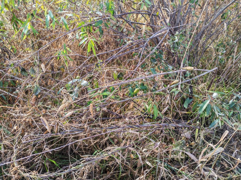 在大咀泡岸堤下发现了一排湿地柳树上悬挂着一些深秋成熟的萝藦果实,湿地岸堤下一行柳树树枝上有条不紊缠绕着萝藦的藤蔓茎。